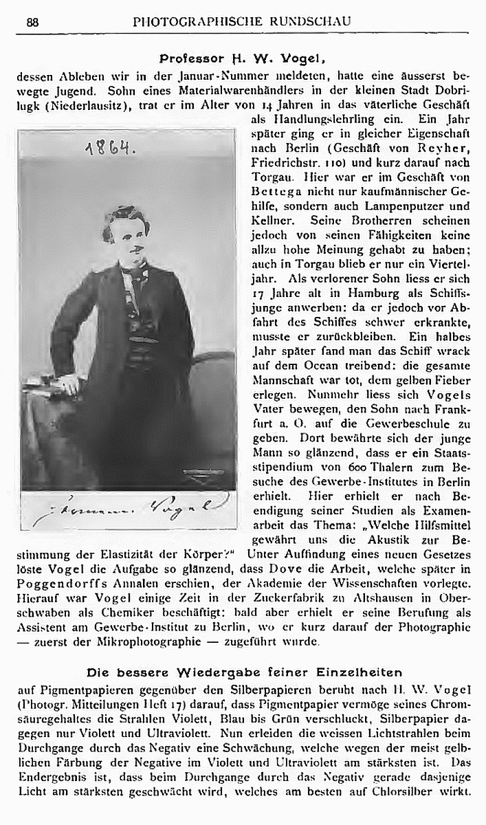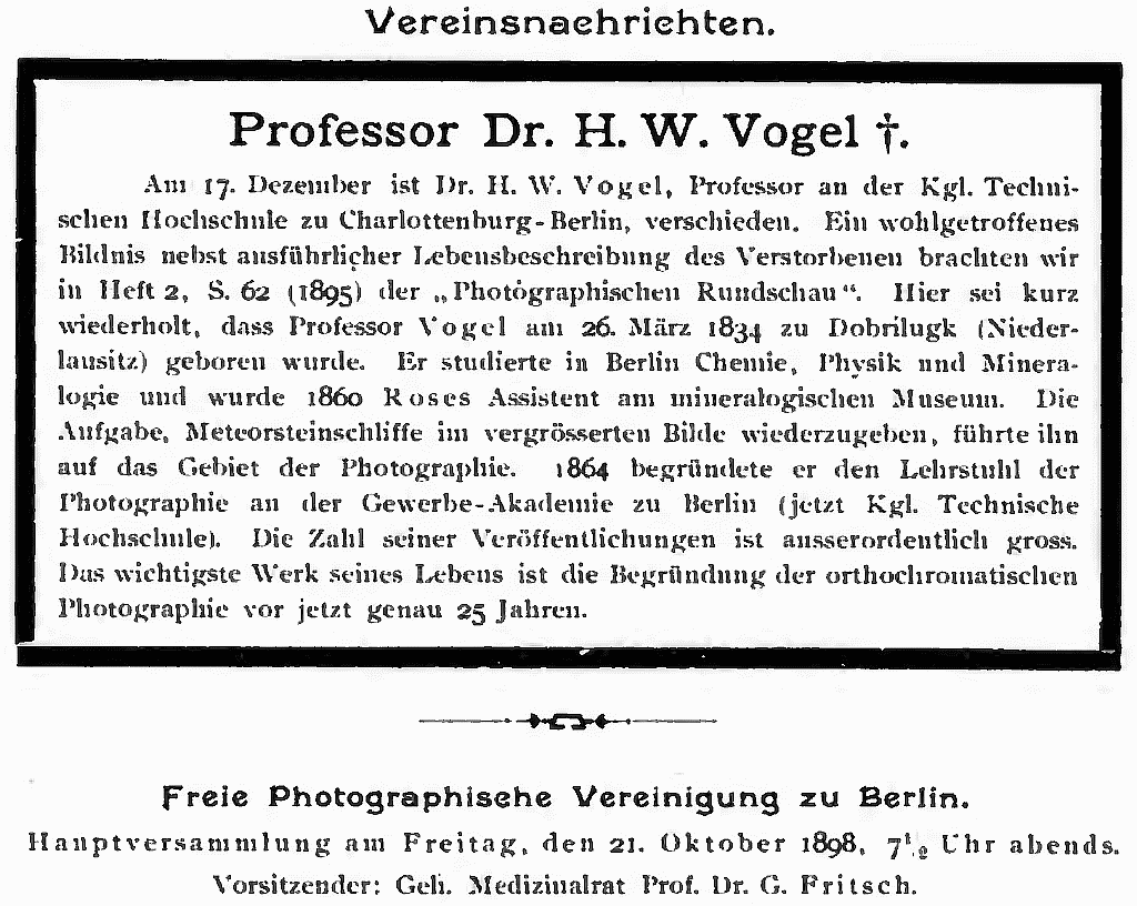 Prof. Hermann Wilhelm Vogel *26.03.1834 †17.12.1898, Fotochemiker und Entdecker der Farbsensibilatoren für die naturgetreue Farbwiedergabe von Fotografien.