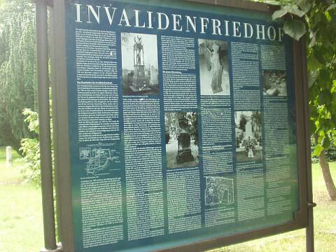 Seit dem Ende des 19. Jahrhunderts fanden auch Zivilpersonen hier eine letzte Ruhestätte. Nach dem Mauerbau am 13. August 1961 lag ein großer Teil des Friedhofes im sog. Todesstreifen. Seit der Maueröffnung vom 9. November 1989 ist der Friedhof wieder frei zugänglich. Näheres auf fremden Seiten im Netz: Invalidenfriedhof bei Wikipedia |