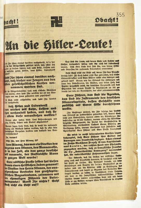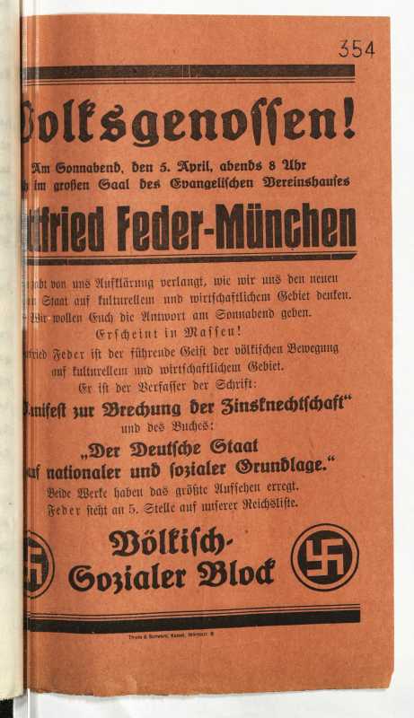Redner versuchte die Lehre Marx zu wiederlegen [sic.], dass nicht alles, was Menschenantlitz trage auch das gleiche Recht haben könne. ( Lachen und großer Lärm. ) Die deutsche Arbeiterschaft stehe aber weit über allen Völkern. Sie stehe auf dem Hochstand reiner Geisteskultur. Marx habe aber ein gleiches Recht für alle gepredigt und habe damit die deutsche Arbeiterschaft auf eine Stufe mit den anderen Völkern gestellt. Die Tatsache sei aber zu verzeichnen, dass der Marxismus Schiffbruch erlitten hätte. ( Zurufe: „aber Ludendorff erst“) Redner: „(Was Ludendorff versprochen hat, das hat er auch gehalten“ ) Große Unruhe. Der Vorsitzende bittet, den Redner ruhig anzuhören. Redner fährt fort, dass er in 30 Jahren in der öffentlichen Werbearbeit stehe und sich nie gescheut habe, für seine Tätigkeit offen einzustehen. Der Klassenkampf sei ein vom jüdischen Geiste des Marxismus getragener Kampf. Es sei nichts anderes, als den Besitz des einen in den des anderen überzuführen ( Lärm. ) Alle die Millionen deutschen Arbeiter seien nicht überzeugte Marxisten. Die Sozialdemokratie haben noch keinem sozialen Gesetz zugestimmt. Wenn sie heute die Diktatur des Proletariats aufrecht erhalten wolle, müsse sie wieder von vorn anfangen. Redner versuchte nun unter vielen Unterbrechungen die Fehler der Sozialdemokratie nachzuweisen und kam auf die Novembertage 1918 zu sprechen. Sodann wies er nach, wie die Politik der Sozialdemokratie Schiffbruch erlitten habe. ( Zurufe: Weil Ihr sie sabotiert habt. ) In dem allgemeinen Lärm war der Redner nur schwer zu verstehen. Als er darauf zu sprechen kam, dass auch die Sozialdemokratie mit Schuld daran trüge, dass auch der Achtstundentag fallen müsse, erhob sich ein solch grosser Lärm, dass der Redner längere Zeit aussetzen musste. Redner führte dann noch aus, dass die deutschnationale Politik sich niemals dazu hergeben würde, die Rechte der deutschen Arbeiter zu sabotieren. Er habe die Ehre in dem deutschnationalen Arbeiterbund, die Rechte von 300 000 Arbeitern zu vertreten. Diese ständen am 4. Mai hinter der deutschnationalen Arbeiter-Partei. Wie die sozialdemokratische Partei aber dann aussehen werde, müsse man anwarten [sic.]. ( Zurufe: Schwindel. ) Die letzten 5 Jahre hätten es bewiesen,
