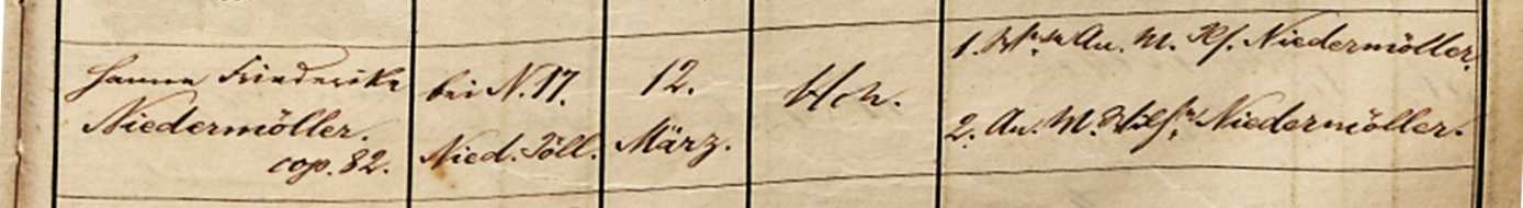 Hanne Friederike Niedermöller. cop.82. | bei N.17. Nied. Jöll. [Niederjöllenbeck] | 12. März. | [unleserlich] | [Als Taufzeugen sind genannt 2 Pers.aus d. Fam. Niedermöller]